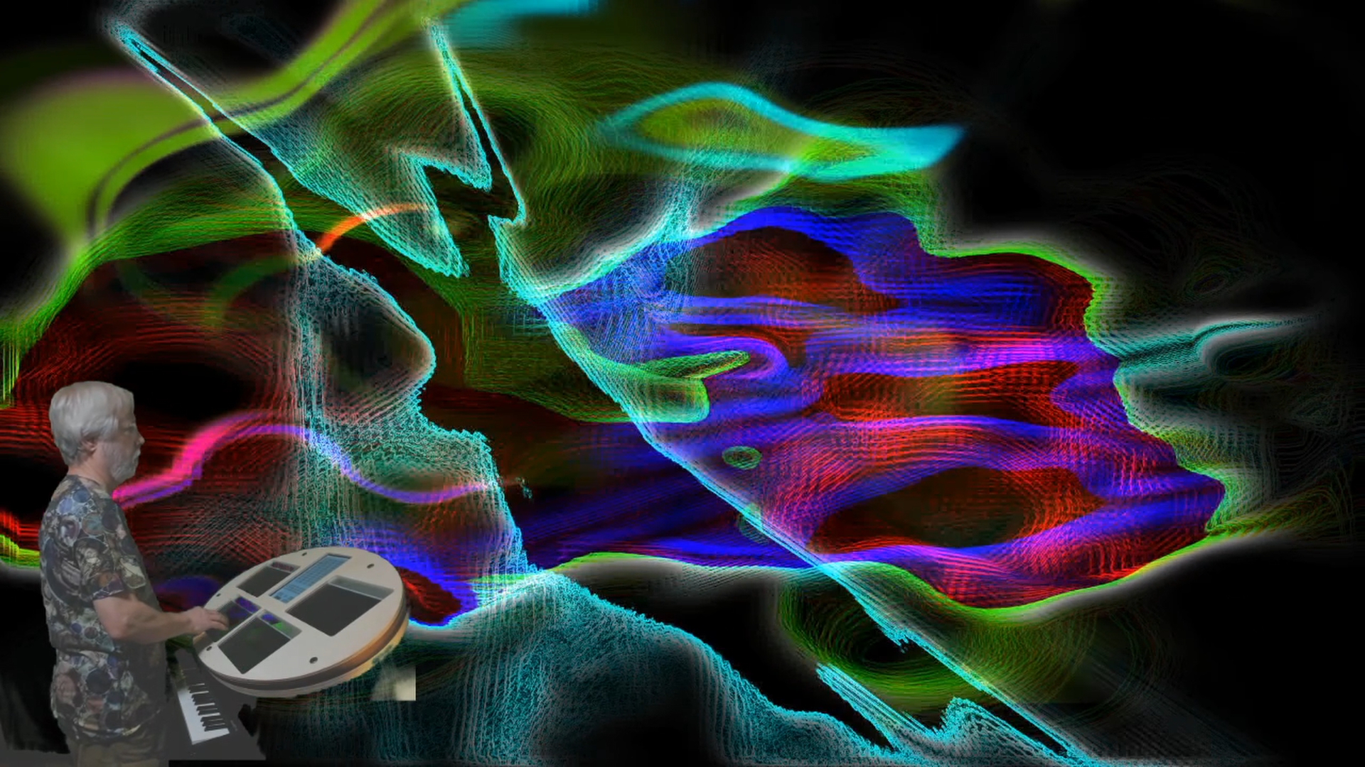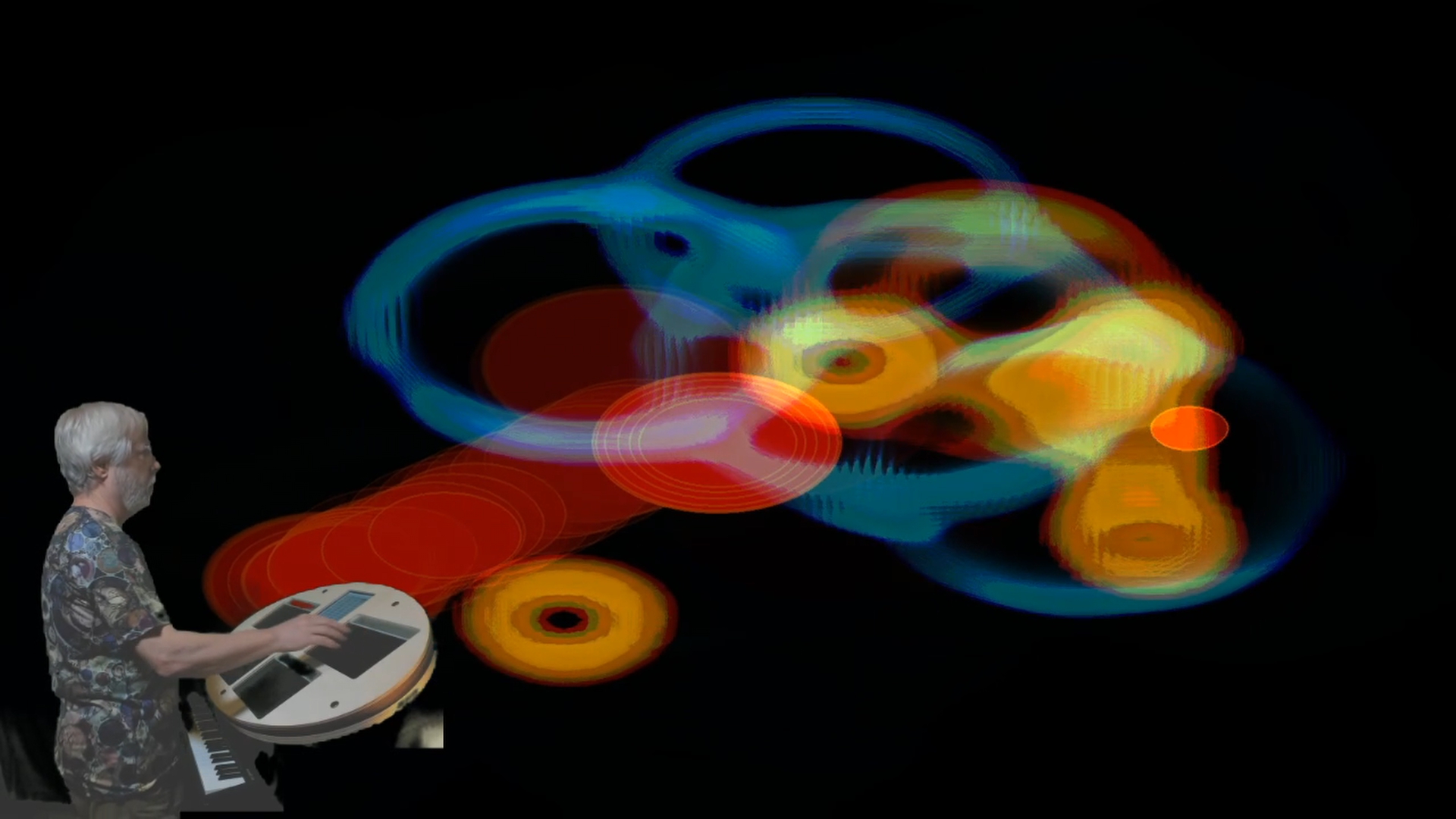 Tim Thompson is a software engineer, musician, and interactive installation artist. His wide-ranging artistic work includes a programming language for MIDI, interactive installations at Burning Man and other festivals, musical performances with Playstation dance pads and QWERTY keyboards, and realtime video looping and processing with a handheld security camera. Recently, Tim has focused on the expressive potential of three-dimensional input in visual music instruments, using devices such as the Microsoft Kinect (in the original Space Palette) and the Sensel Morph (in the newer Space Palette Pro). His website is https://timthompson.com