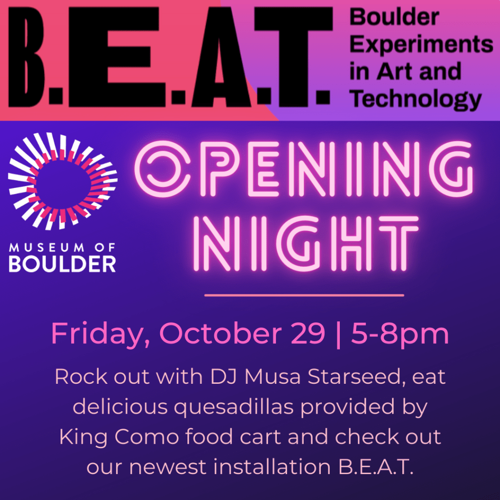 Friday, Oct. 29th | 5-9pm MDT | The Museum of Boulder | The Museum of Boulder for the Opening Reception of our newest Exhibit Boulder Experiments in Art and Technology (B.E.A.T) “Convivial Machines”. $20 includes (1) Quesadilla, Exclusive access to B.E.A.T, Live music performed by DJ Musa. I’m an exhibitor and have a few vides included in the installation. Organizers mentioned I could share the discount code with the RMSM members which will get you $5 off admission. Code is EXHIBITOR.